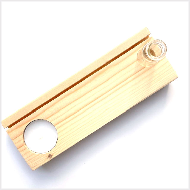 Dit gedenkplankje heeft i.p.v. een reageerbuisvaasje en stevig mini vaasje. Verder is het identiek aan het originele gedenkplekje. Dus met waxinelichtje en dezelfde afmeting 20 x 7 x 2,8 cm.