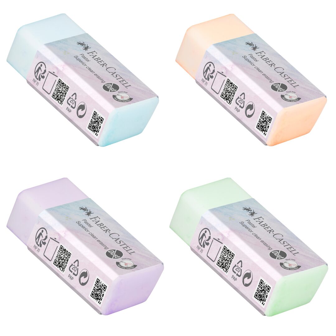 Gummen zonder rommel. Het stof van de gum wordt niet verspreid maar samengerold. Gum in heerlijke pastelkleurtjes: lichtblauw, lila, lichtgroen en zalmroze.