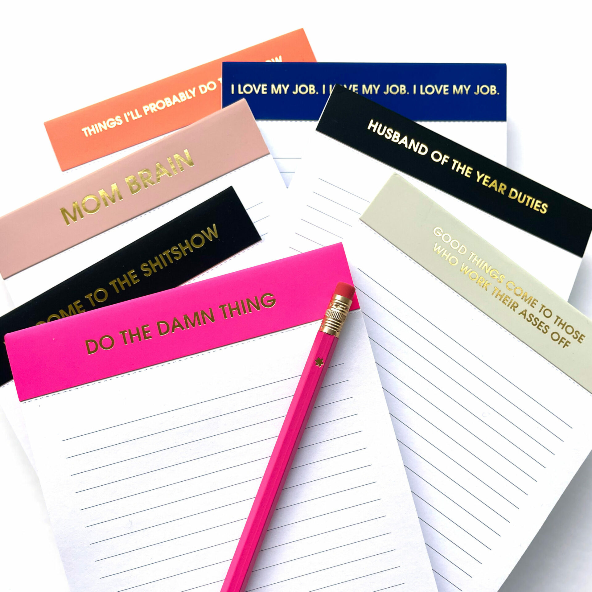 Memo blok | Do the damn thing – hardroze, Good things come to those who work their asses off – lichtgrijs, Husband of the year duties – zwart, I love my job – donkerblauw, Mom brain – dusty pink, Things I will probably do tomorrow – oranje, Welcome to the shitshow – zwart |