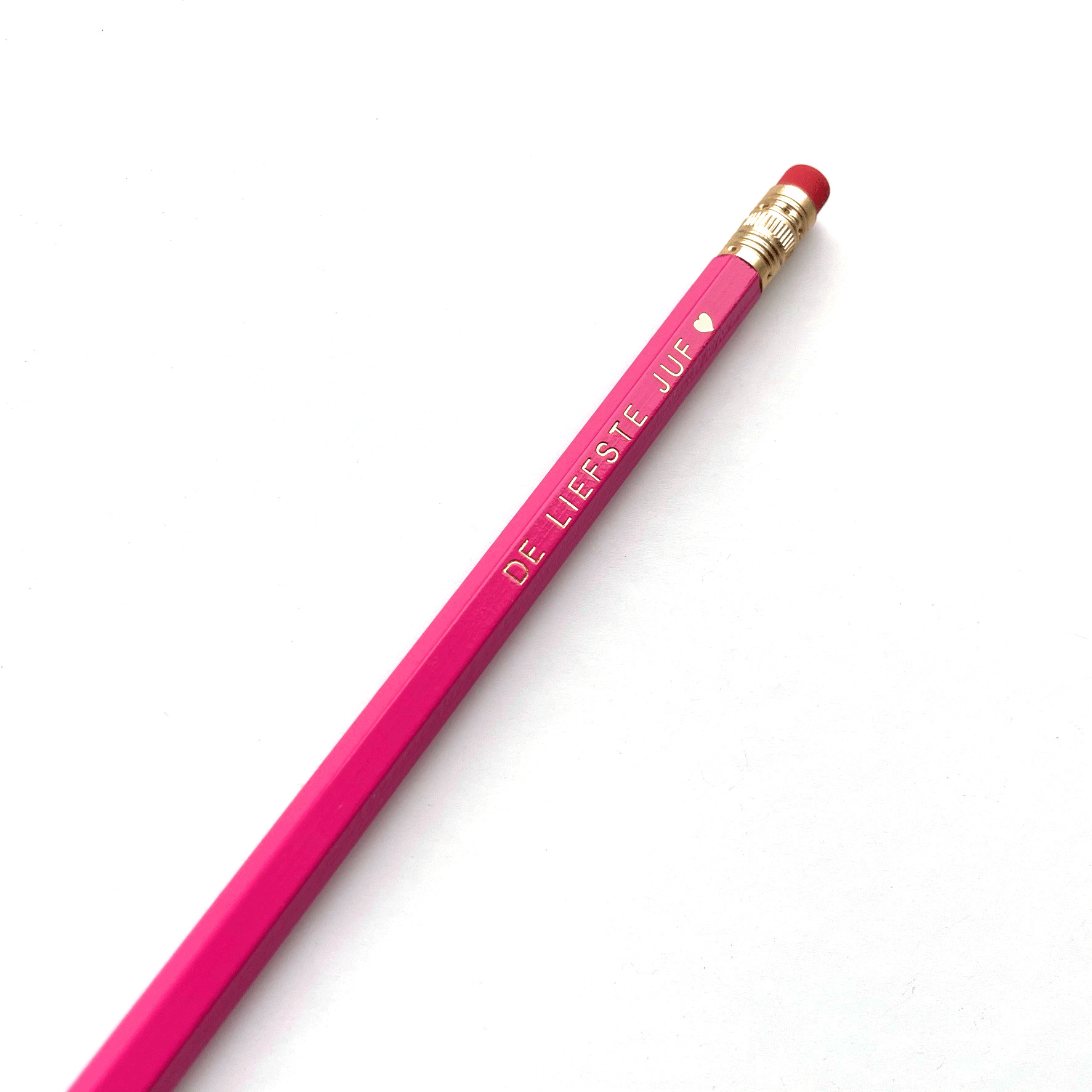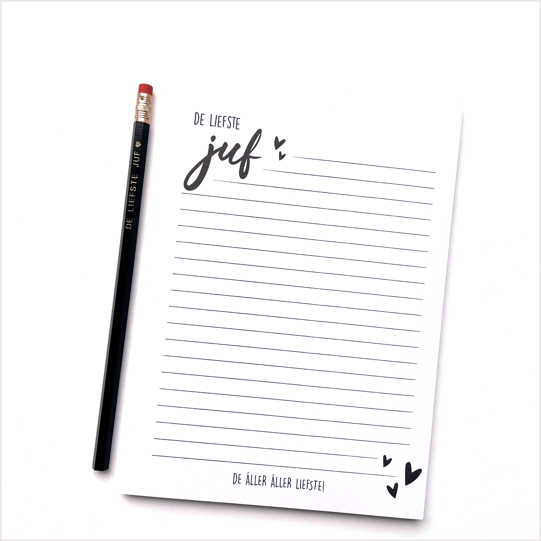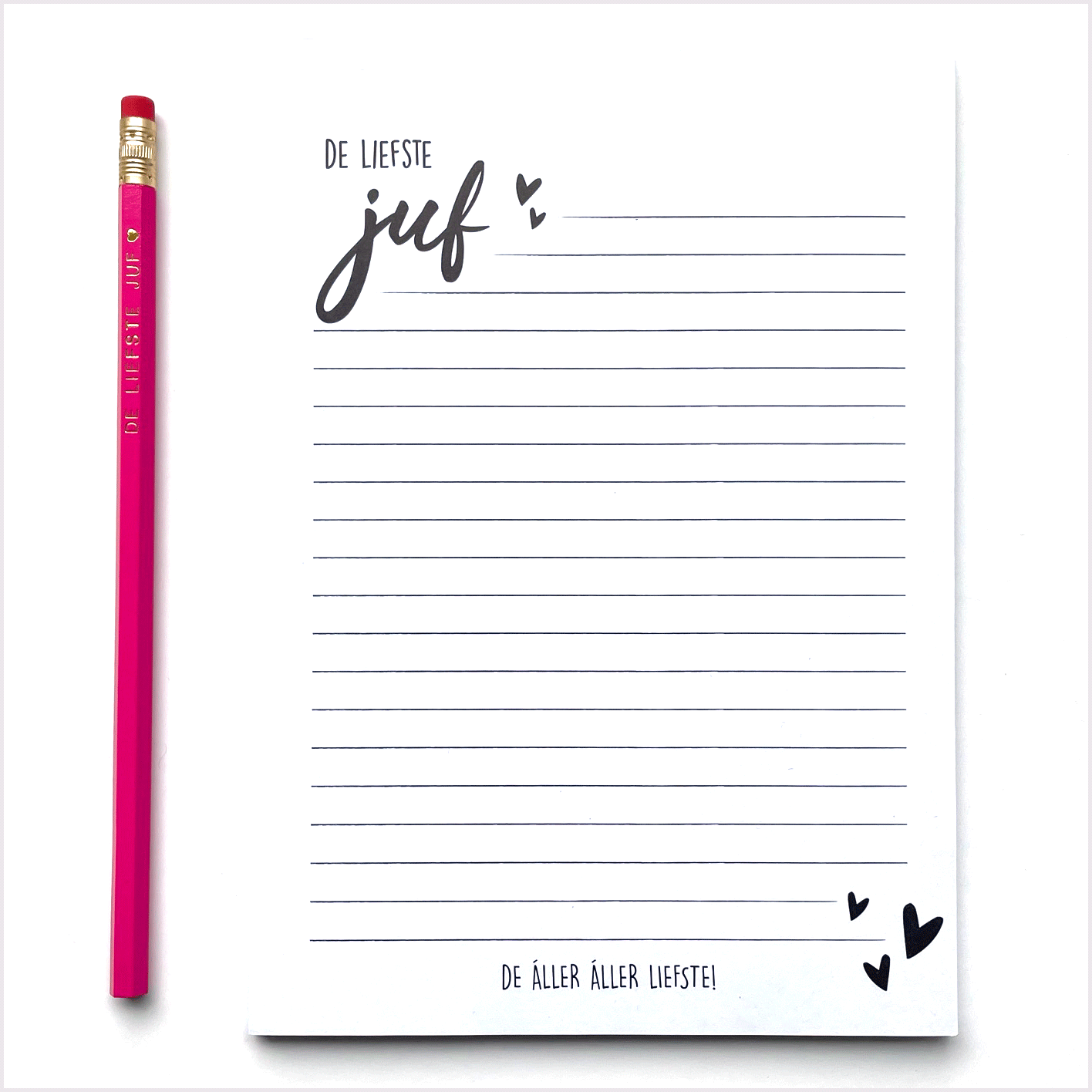 Bij een fijn juffenpotlood hoort natuurlijk ook een leuk juffen notitieblokje. Dit notitieblokje wordt samen met een bijpassend potlood voorzien van de tekst DE LIEFSTE JUF ♥ verkocht. Er is keuze uit twee verschillende kleuren schrijfpotloden HB. Namelijk een zwarte of een hardroze variant. Het setje wordt mooi verpakt geleverd in een pergamijnen zakje voorzien van een juffensticker. Je kunt het dus zo cadeau geven.