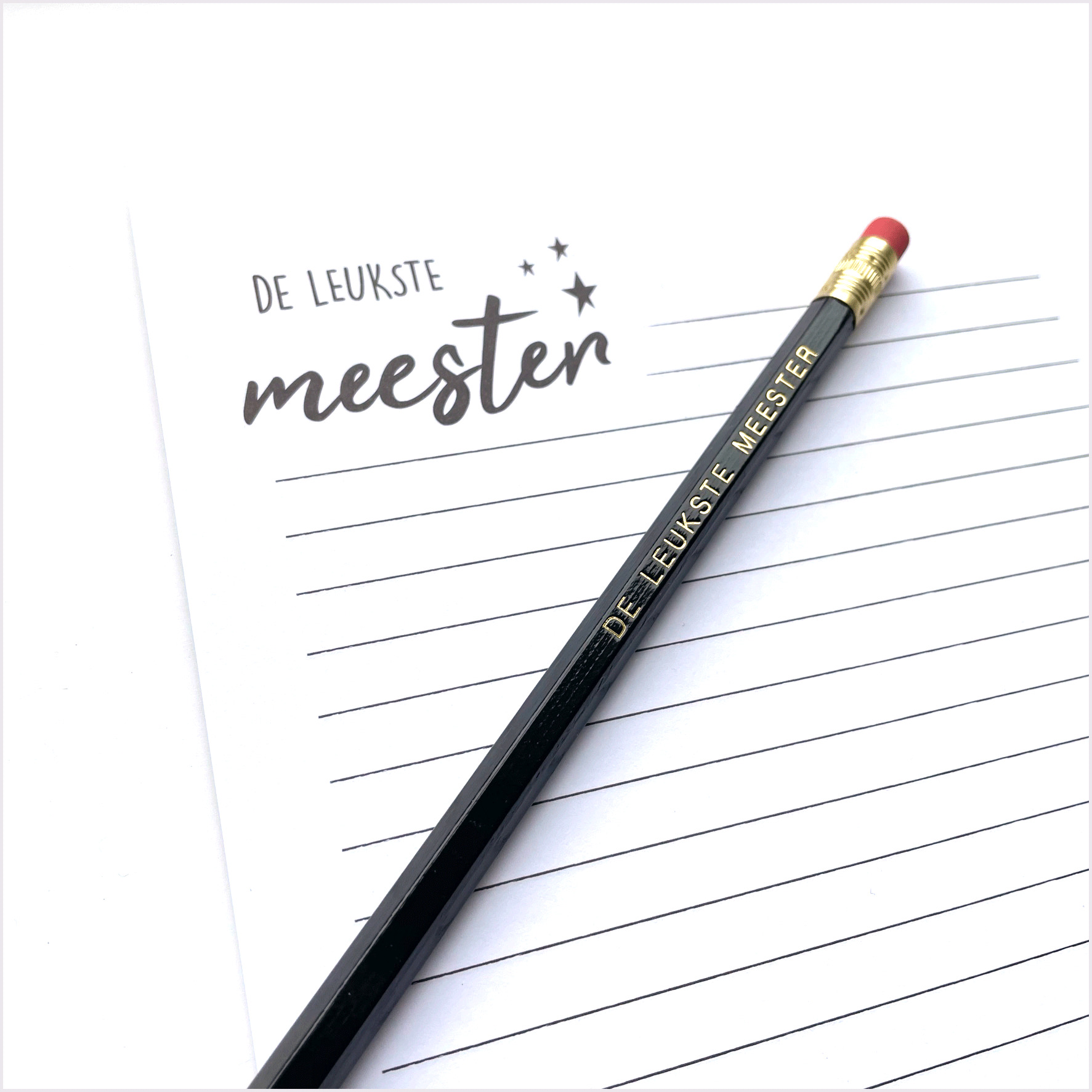 Notitieblokje voor de leukste meester. Dit notieboekje geef je natuurlijk graag aan jouw meester. Want hij is toch de allerleukste? Deze uitvoering is zonder potlood. Er is ook een uitvoering met een bijpassend schrijfpotlood voorzien van de tekst DE LEUKSTE MEESTER.
