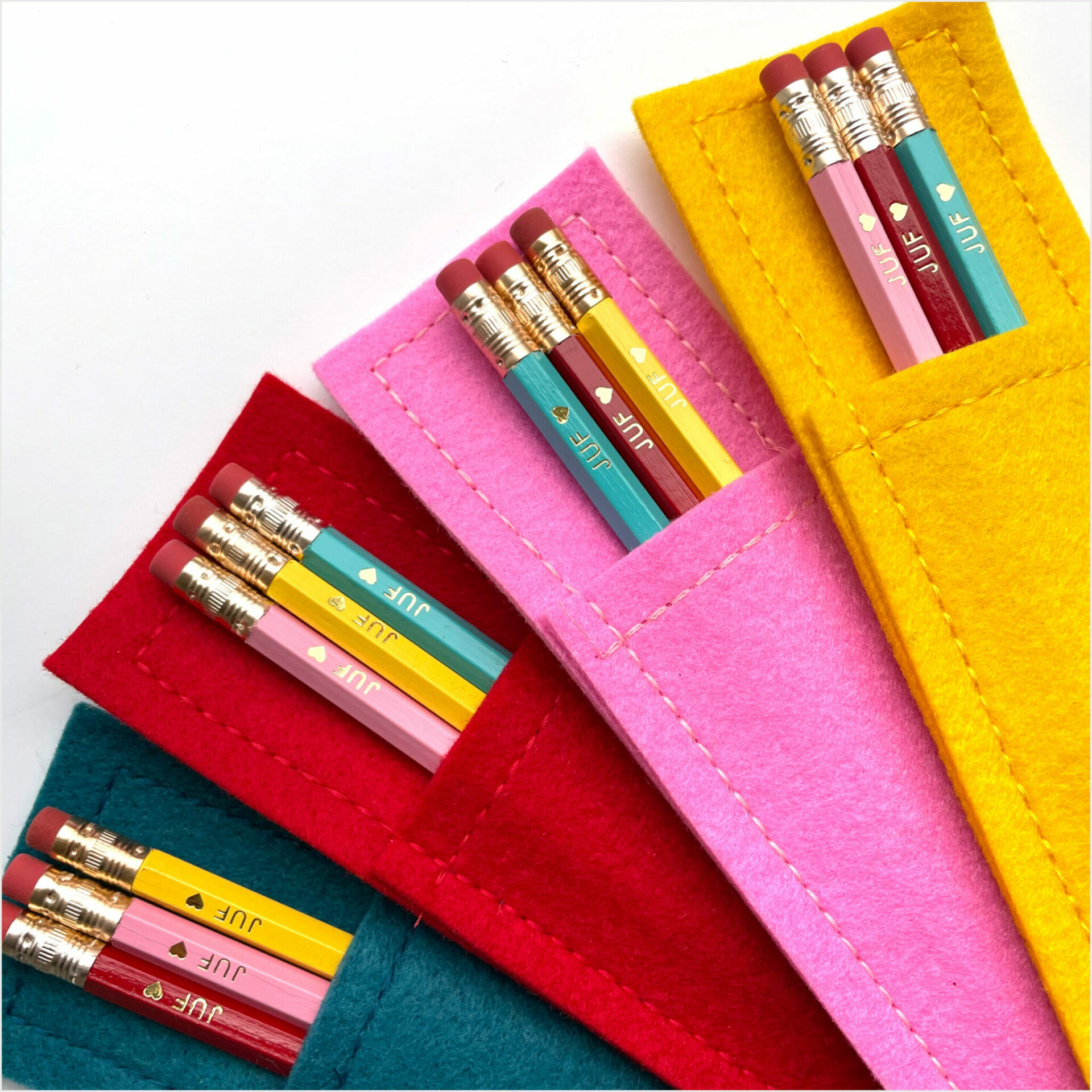 Een juf kan een fijn schrijfpotlood altijd wel gebruiken. Wil je haar een uniek juffenbedankje geven? Denk dan eens aan dit fleurige setje van drie potloden met de opdruk JUF ♥ in een lekker zacht vilten hoesje. Door de vrolijke kleuren vallen zowel de potloden als het hoesje lekker snel op en zijn ze makkelijk terug te vinden op het bureau of in de tas van de juf.