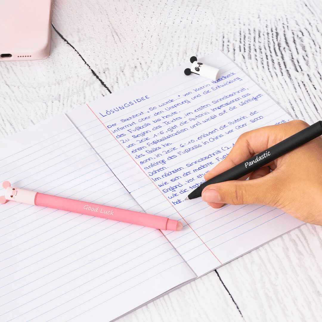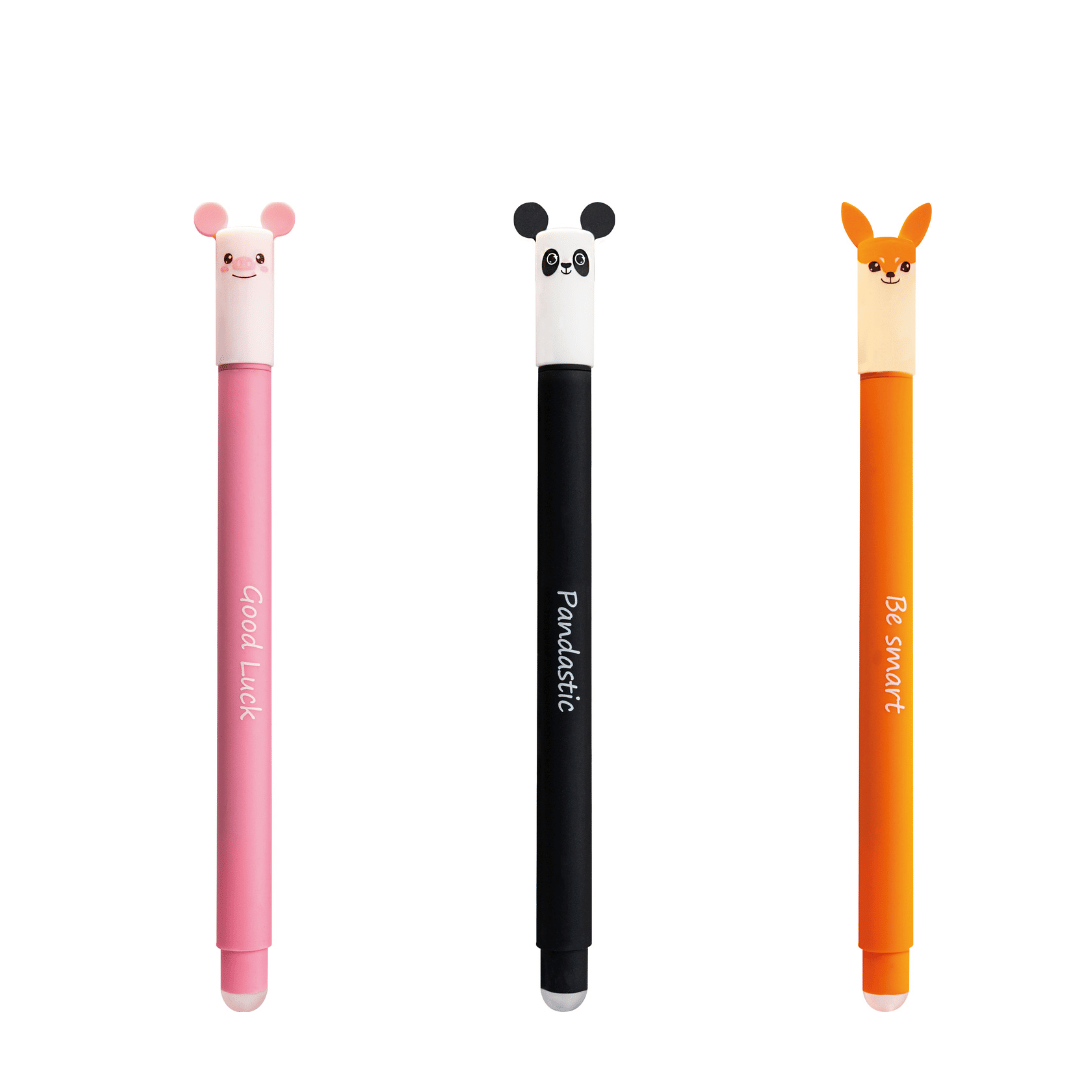 De meeste potloden van Uniek Potlood hebben een gummetje om foutjes mee te kunnen wissen. Wil je nu echter liever niet met een potlood schrijven. Dan zijn er ook uitwisbare gelpennen. Ze zijn er in 3 varianten. Een roze biggetje met de tekst Good Luck. Een zwarte panda met de tekst Pandastic en een oranje vos met de tekst Be Smart.