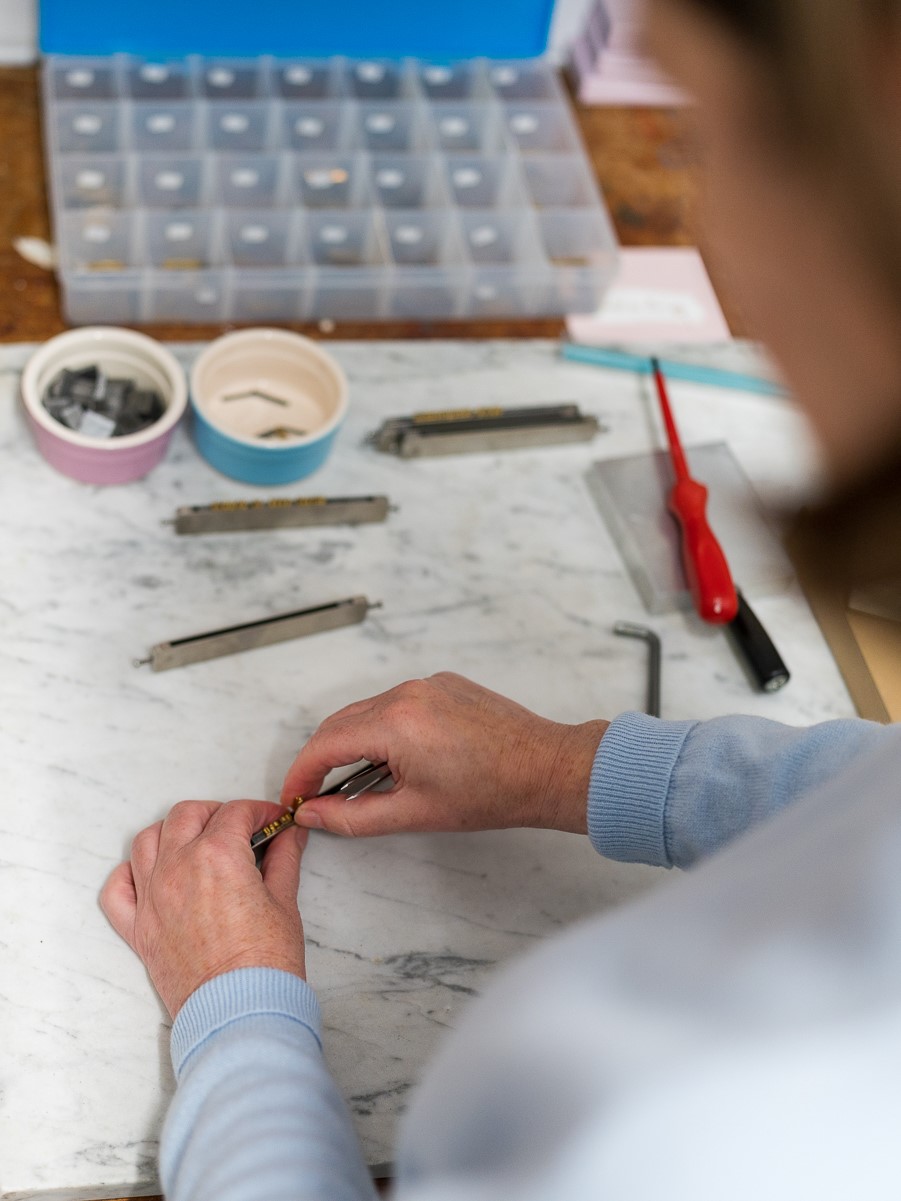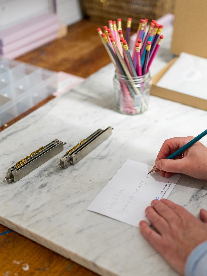 Elk lettertje wordt handmatig in spiegelbeeld gezet. Daarna wordt elk potlood apart bedrukt.